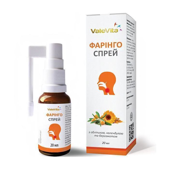 ValeVita Фарінго Спрей – натуральний оригінальний природний продукт на основі комбинації трьох натуральних олій що створюють захисний шар на слизовій оболонці рота і горла усувають відчуття дискомфорту і болю в горлі полегшують процес ковтання. Дія спрею зумовлена кожним із його компонентів.