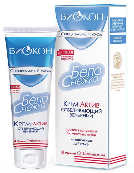 Равномерно отбеливает пигментные пятна и веснушки, благодаря рабочим концентрациям 3-х отбеливающих комплексов. Препятствует процессу образования темного пигмента в коже. Является основным отбеливающим средством косметической программы «Белоснежка».