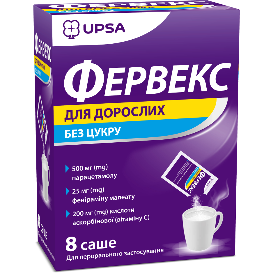 - 1 саше содержит: парацетамола 500 мг, аскорбиновой кислоты (витамина С) 200 мг, фенирамина малеата 25 мг;