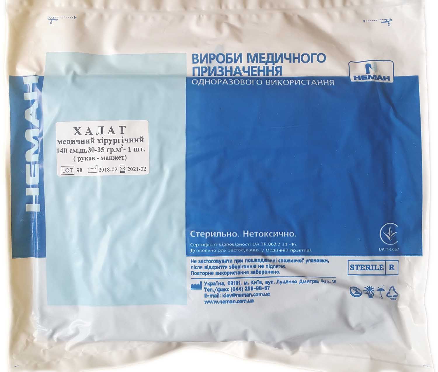 Халаты хирургические являются наиболее широко используемым видом одноразовой одежды. Как правило, халаты изготовляются из нетканых материалов плотностью 20-25 или 35-42 г/кв. м. Халаты хирургические различаются по длине (стандартные длины: 110 и 140 см. ), по типу рукава (с манжетой или на резинке). Кроме того, хирургический халат может иметь ламинированную переднюю поверхность и рукава.