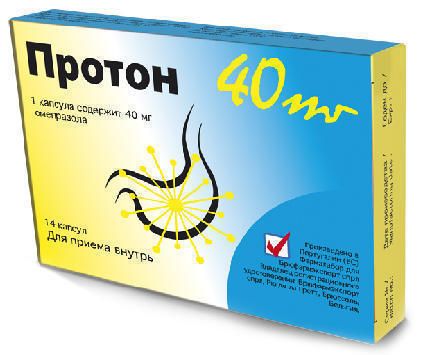 капсулы 40 мг твердые желатиновые капсулы №0, непрозрачные, крышечка красного цвета с надписью PROTON черными чернилами, корпус белого цвета с надписью 40 черными чернилами, капсула содержит кишечно гранулы, белые или светло-бежевые, круглые с гладкой поверхностью.
