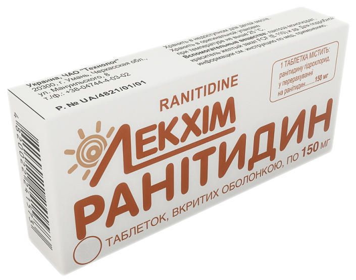 действующее вещество: ранитидин; 1 таблетка содержит ранитидина гидрохлорида в пересчете на ранитидин 150 мг;