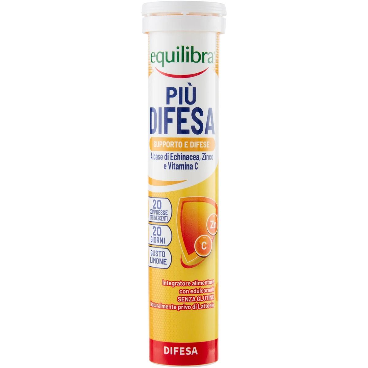 Più Difesa Equilibra — харчова добавка у формі шипучих таблеток зі смаком лимону на основі ехінацеї, цинку та вітаміну C. Формула сприяє підтримці імунної системи, захисту клітин від окисного стресу та нормальному функціонуванню верхніх дихальних шляхів, особливо в періоди підвищеного навантаження на організм.