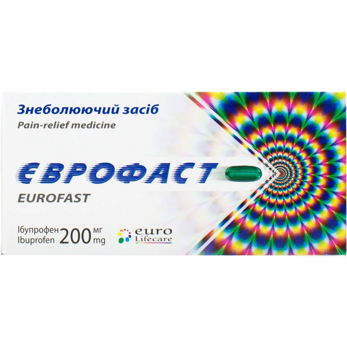 - капсули Єврофаст по 200 мг: овальні м’які желатинові капсули від блакитно-зеленого до світло-зеленого кольору, що містять прозору в’язку рідину від безбарвного до блідо-жовтого кольору, з маркуванням «133» чорним кольором на капсульній оболонці. (Допускається зміна відтінку вмісту капсули готового продукту на світло-зелений протягом терміну придатності);