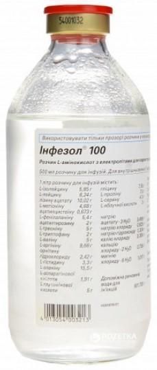Інфезол® 100 застосовувати з великою обережністю і лише після ретельної оцінки співвідношення очікуваної користі та можливого ризику у хворих із порушенням обміну амінокислот гіперкаліємії гіпонатріємії та підвищеної осмолярності сироватки крові. При наявності гіпотонічної дегідратації перед початком парентерального харчування слід забезпечити організм рідиною та електролітами. При недостатності надниркових залоз при печінковій нирковій серцевій та легеневій недостатності необхідне індивідуальне визначення дозування. Під час застосування Інфезолу® 100 треба проводити контроль вмісту протеїнів в крові водно-електролітного балансу осмолярності сироватки крові кислотно-лужного складу сироватки крові рівня цукру в крові та показників функції печінки та нирок (сечовини крові креатиніну). Частота клінічного та лабораторного обстеження хворого залежить від тяжкості захворювання і його клінічного стану. Особливо часто таке обстеження рекомендується проводити при таких станах: порушення обміну амінокислот печінкова недостатність ризик виникнення або погіршення вже наявних неврологічних розладів пов’язаних із гіперамоніємією; ниркова недостатність передусім при наявності гіперкаліємії наявність факторів ризику що сприяють виникненню або поглибленню метаболічного ацидозу та при азотемії внаслідок порушеного ренального кліренсу. Треба бути обережним при підвищеній осмолярності сироватки крові у хворого. Слід мати на увазі що Інфезол® 100 – це лише один із компонентів парентерального харчування і для повноцінного парентерального харчування треба одночасне застосування інших джерел енергії (розчини вуглеводів жирові емульсії у урахуванням потреби в незамінних жирних кислотах) електролітів вітамінів та мікроелементів. При тривалому застосуванні препарату (кілька тижнів) слід ретельно контролювати параметри крові та фактори згортання. Інфезол® 100 містить 5 4 г/л фенілаланіну і може бути шкідливим для хворих на фенілкетонурію.