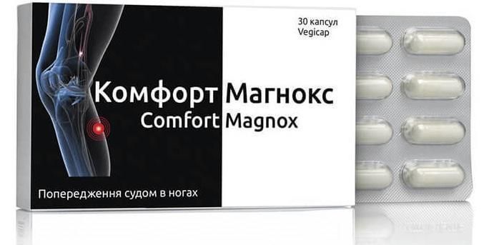 Комфорт Магнокс сприяє усуненню і попередженню виникнення судом у ногах (особливо нічних), а також допомагає при так званому синдромі «неспокійних ніг» і впливає на інші прояви дефіциту магнію. Комфорт Магнокс - капсула рослинного походження з гідроксипропілметилцелюлозою (Vegicap), гранульований магнієвий комплекс (моногідрат оксиду магнію), видобутий з мінералів Мертвого моря. До складу препарату також входять вітаміни Е і В6. Натуральні складові Комфорт Магнокс не містять ГМО, цукру, консервантів, штучних барвників, дріжджів, пшениці, кукурудзи, клейковини, продуктів тваринного походження, молочних і соєвих продуктів.
