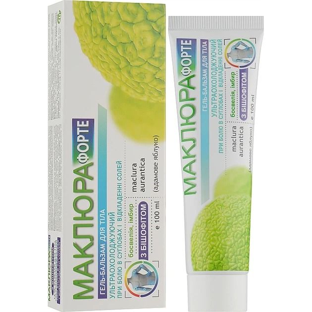 Гель-бальзам Маклюра форте призначений для застосування при болях в суглобах і при відкладенні солей. Гель ефективний при спортивних і побутових травмах суглобів (удари, розтягнення, вивихи). Сприяє зняттю м'язового перенапруження для активізації процесів відновлення функціональності суглобів і м'язів. Зупиняє запальні процеси, усуває набряки, нормалізує кровообіг і мікроциркуляцію в проблемних зонах.