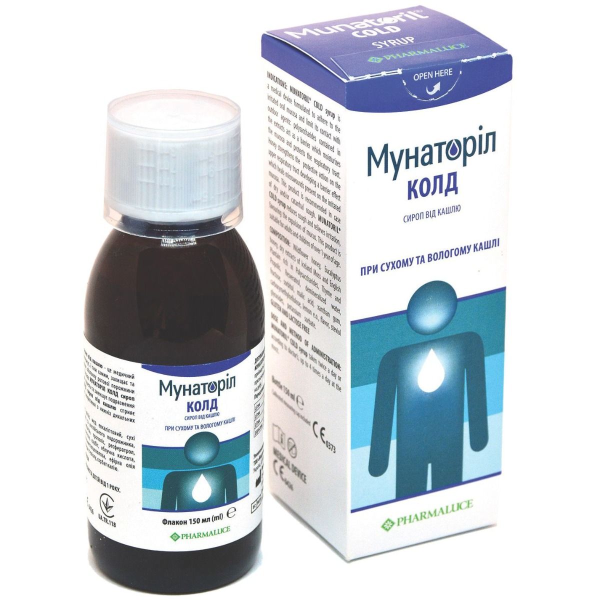 Мунаторiл колд сироп вiд кашлю - це медичний вирiб, який обволікає та зволожує, і тим самим захищає та заспокоює подразнену слизову оболонку ротової порожнини та горла. Завдяки своєму складу мунаторiл колд сироп вiд кашлю заспокоює сухий кашель та зменшує подразнення спизової. Мунаторiл колд сироп вiд кашлю сприяє розрiдженню та виведенню мокротиння з нижнiх дихальних шляхiв при вологому кашлi.