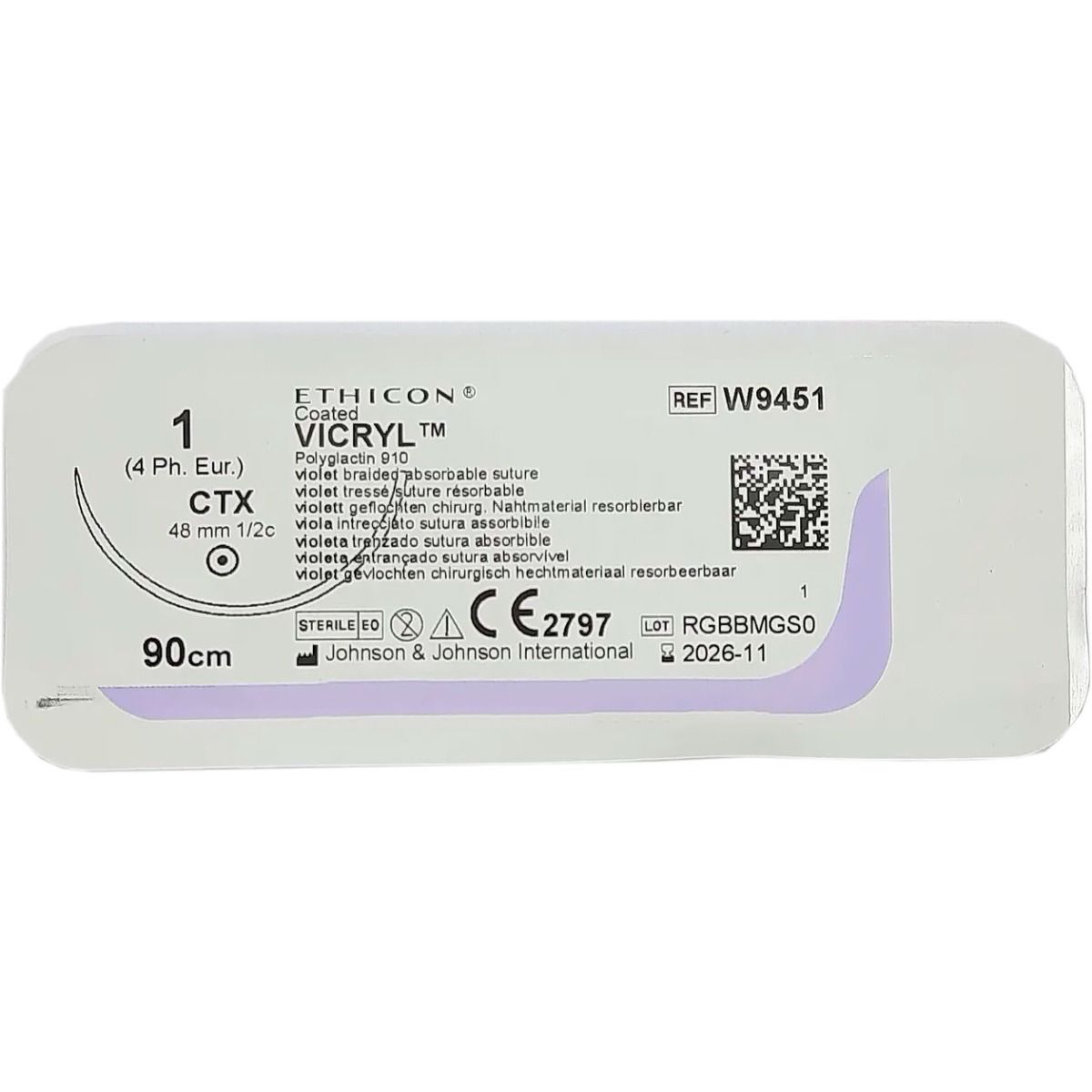 Нитка Вікрил 1 голка 48 мм колюча 90 см 1/2 кола, фіолетова (W9451) Ethicon (Шотландія)
