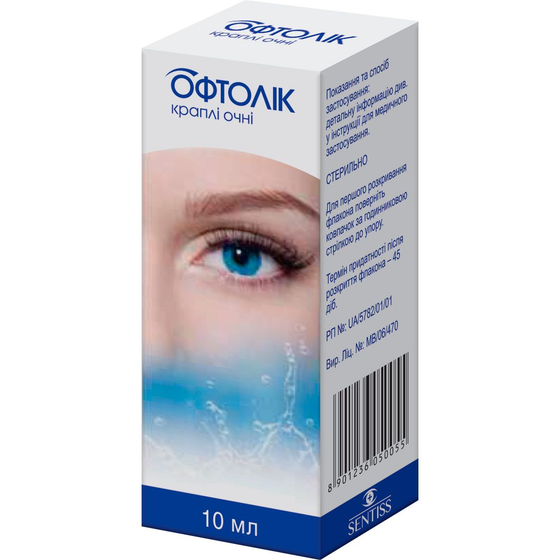 Офтолік – препарат, що чинить захисну дію на рогівку ока при зниженні секреції слізної рідини, забезпечує необхідний зволожувальний ефект, тривало контактуючи з рогівкою ока. Основний компонент – полівініловий спирт, має властивості, подібні до властивостей муцину (речовини, що продукується кон'юнктивою ока). У комбінації з повідоном забезпечує посилення ефекту змащування, що призводить до зменшення подразнення та сухості поверхні ока. Потовщення слізної плівки забезпечує заспокійливу дію на око у випадку зміни властивостей муцину, наприклад, при застудних захворюваннях, бактеріальних, грибкових і запальних ураженнях очей. Захисна функція потовщеного шару сльози особливо помітна при травмах і ерозіях кон'юнктиви і рогівки.