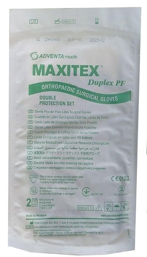 Стійкість до розривів та проколів, в поєднанні з міцністю на розрив подвійних хірургічних рукавичок Maxitex Duplex PF забезпечує незамінний захист при оперативних втручаннях високого ризику, а також в травматології та ортопедії. Володіючи текстурованою поверхнею, верхня рукавичка забезпечує чудове захоплення при роботі з інструментами і шовним матеріалом, а світло-коричневий колір зменшує відблиски від хірургічних ламп.