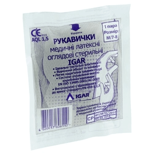Оглядові медичні рукавички торгової марки IGAR - стерильні, виготовлені з високоякісного латексу біло-прозорого кольору.