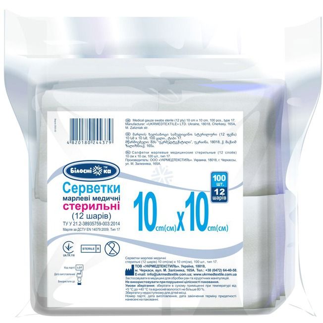 Серветки марлеві Білосніжка стерильні 10х10 см 12 шарові №100 Укрмедтекстиль ТОВ (Україна)