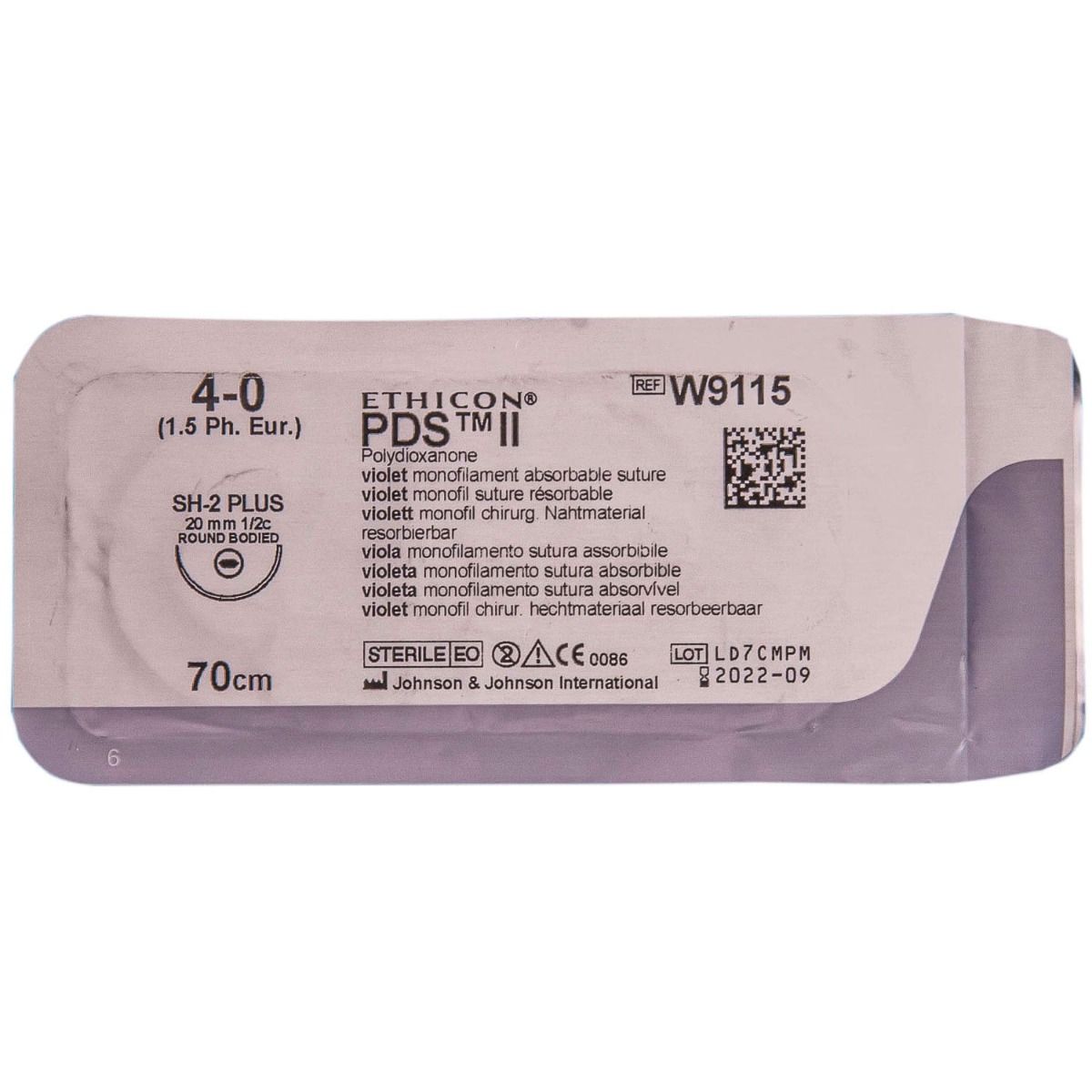 Шовний матеріал ПДС ІІ розмір USP 4-0, колюча голка 20 мм, 1/2 кола, довжина 70 см фіолетовий W9115 Ethicon (США)