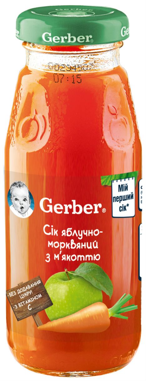 Сік "Яблучно-морквяний з м'якоттю" Gerber готовий до вживання. Без додавання цукру. Спеціальний спосіб приготування дозволяє зберегти смак, запах і колір натуральних фруктів. До складу соків Gerber входить вітамін С, який сприяє нормальному функціонуванню імунної системи малюка.