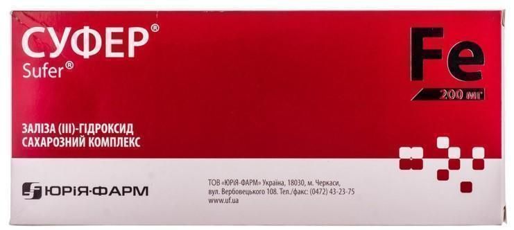 Взаємодія з іншими лікарськими засобами та інші види взаємодій. Суфер® не слід застосовувати одночасно із залізовмісними пероральними засобами оскільки абсорбція заліза застосовуваного внутрішньо знижується. Тому лікування пероральними препаратами заліза слід починати не раніше ніж через 5 днів після останньої ін'єкції Суферу®.