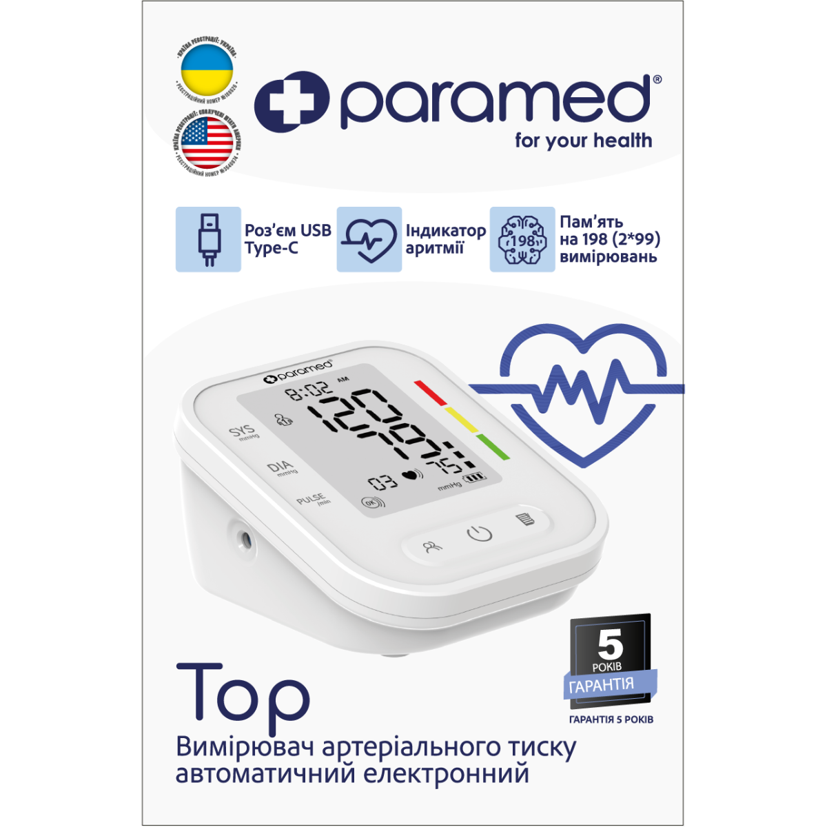 Paramed Top - це базовий автоматичний тонометр. Модель проста у використанні, має усі базові функції. Оснащена великим екраном, універсальною манжетою та USB type-c портом.