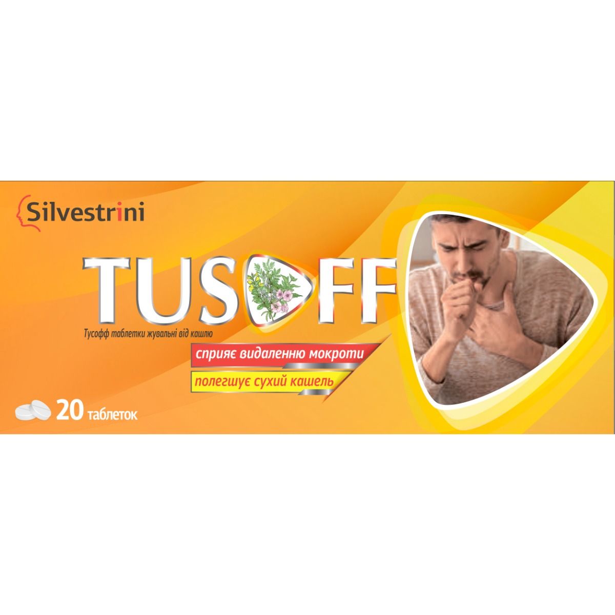 Дієтична добавка Тусофф з підсолоджувачами. Таблетки жувальні від кашлю, не містять цукру.