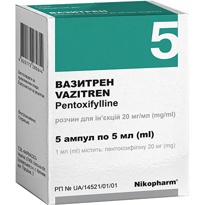 - Внутрішньовенна інфузія 100-600 мг пентоксифіліну у 100-500 мл розчину Рінгера лактату, 0,9 % розчину натрію хлориду або 5 % розчину глюкози 1-2 рази на добу. Тривалість внутрішньовенної краплинної інфузії становить 60-360 хвилин, тобто введення 100 мг пентоксифіліну має тривати щонайменше 60 хвилин. Інфузія може бути доповнена пероральним прийомом пентоксифіліну (400 мг) із розрахунку, що максимальна добова доза (інфузійна і пероральна) становить 1200 мг.