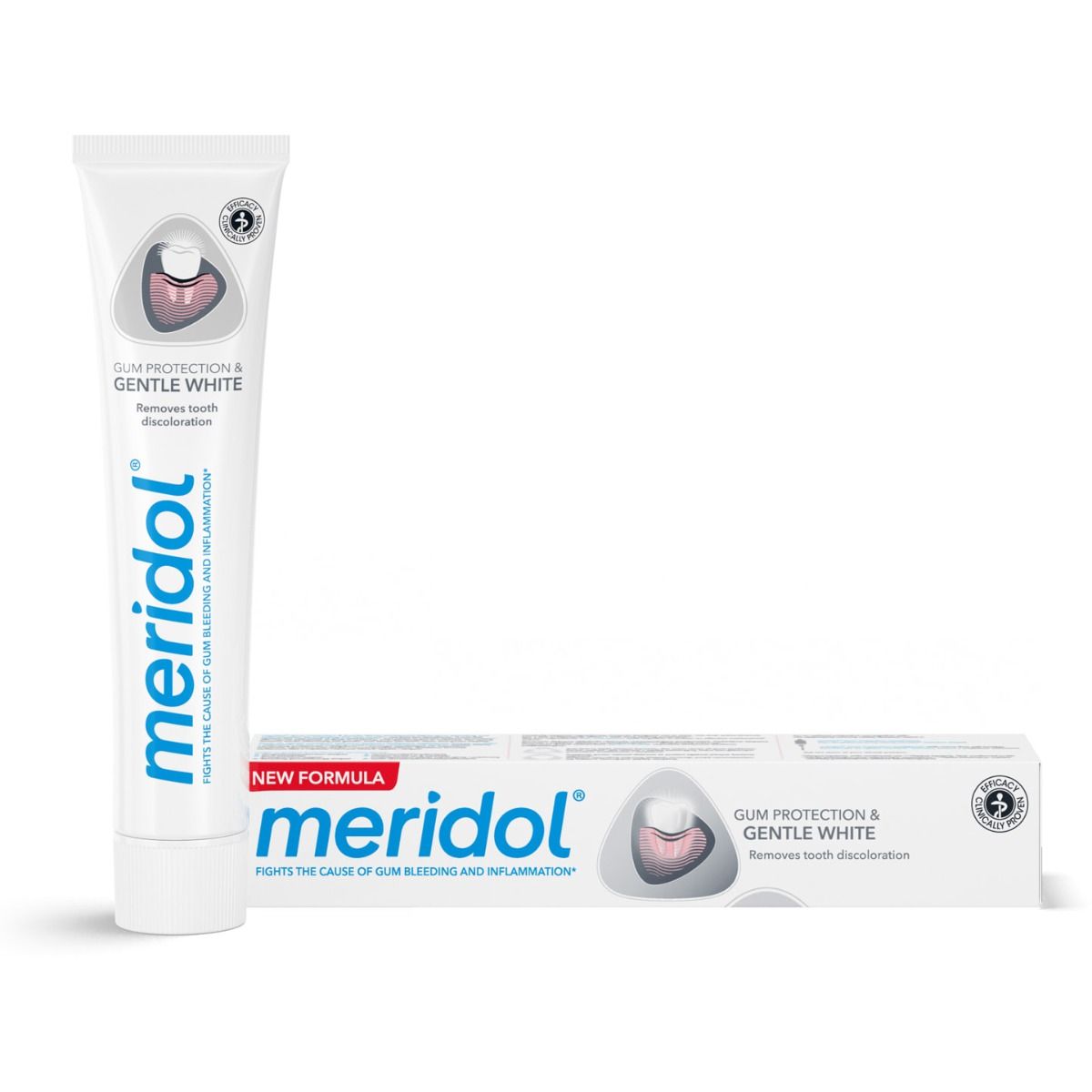 Подвійне фторидне поєднання забезпечує ефективний захист від карієсу. М’яка формула очищення meridol Дбайливе Відбілювання усуває непривабливі плями та зміни кольору та дарує вам природньо білі зуби