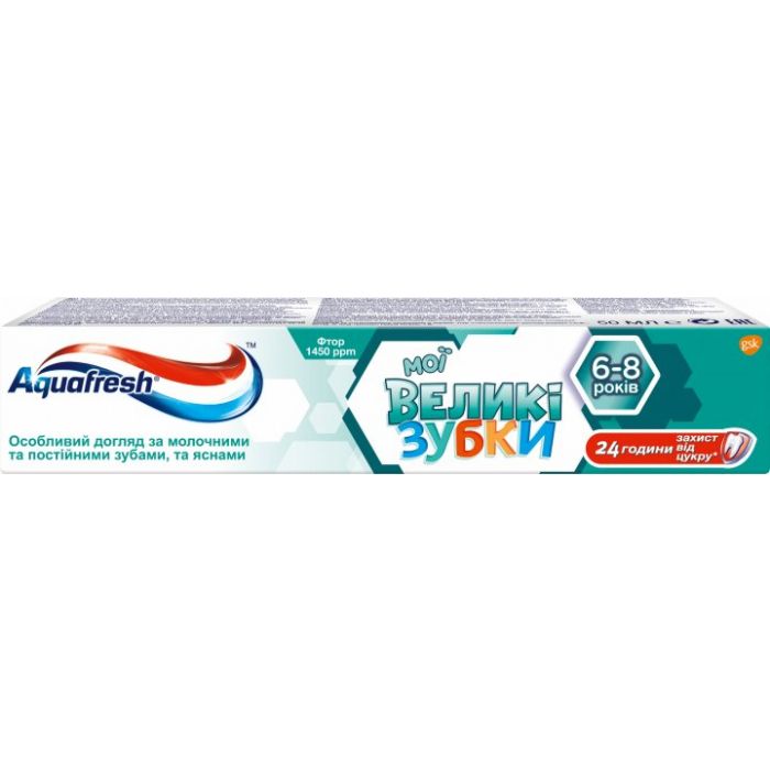 Зубна паста Aquafresh Мої великі зубки для дітей від 6-ти років. Спеціальна формула, що враховує вікові особливості дитини при зміні молочних зубів на постійні. Зміцнює зубну емаль завдяки вмісту фтору, з урахуванням потреб цього віку. Допомагає захистити зуби від карієсу.